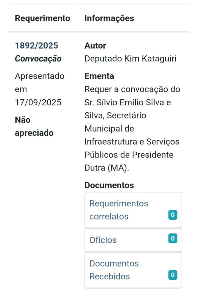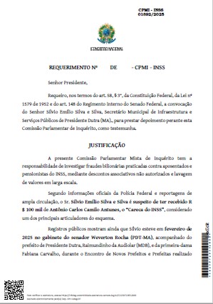 A Comissão Parlamentar Mista de Inquérito (CPMI) que investiga fraudes bilionárias contra aposentados e pensionistas do INSS decidiu convocar o secretário municipal de Infraestrutura e Serviços Públicos de Presidente Dutra (MA), Sílvio Emílio Silva e Silva, para prestar depoimento como testemunha, conforme documentos que a reportagem teve acesso.