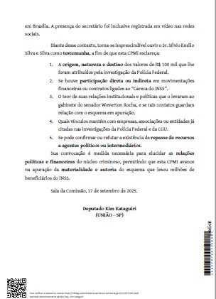 Segundo o requerimento, a CPMI pretende esclarecer a origem e destino do dinheiro, possíveis contratos ou movimentações financeiras ligadas ao “Careca do INSS” e ainda as relações políticas do secretário com parlamentares e empresários investigados.