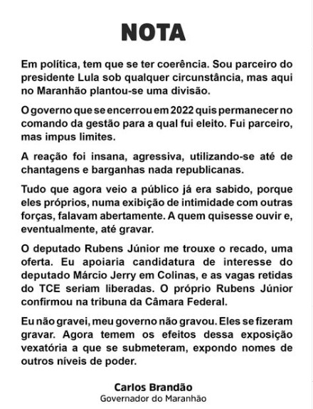 Em meio à crise, nesta quarta-feira (22/10), o governador do Maranhão, Carlos Brandão, utilizou suas redes sociais para se pronunciar oficialmente sobre os acontecimentos. Em tom firme, Brandão reafirmou sua lealdade ao presidente Luiz Inácio Lula da Silva, defendendo coerência política e denunciando o que chamou de “reação insana” por parte de antigos aliados que, segundo ele, tentaram interferir em sua gestão de forma antirrepublicana.