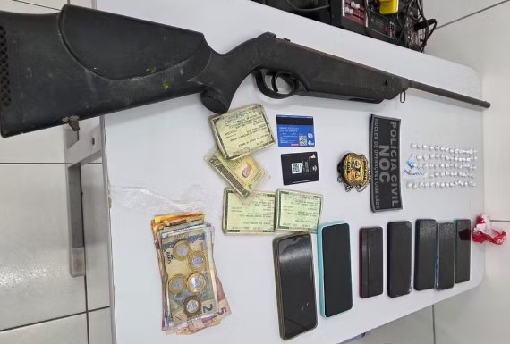 Durante o cumprimento do mandado de busca e apreensão, os agentes encontraram 72 pedras de crack, cerca de R$ 290 em dinheiro, uma espingarda calibre .22, diversos celulares e outros itens suspeitos de serem produtos de furto.