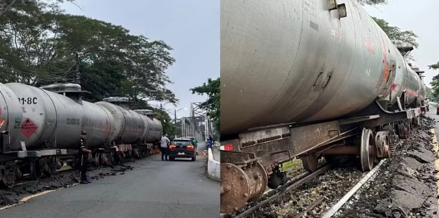 A parte traseira do trem continua descarrilada em Timon. Uma escolta armada faz a segurança da carga de combustíveis.